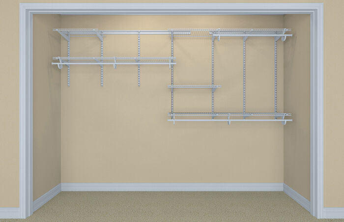 The ClosetMaid® 7-10 ft. ShelfTrack® Closet Organizer Kit offers configuration and shelf location adjustability. The ShelfTrack® system is an adjustable standards and bracket program. Hang rods attach to the SuperSlide® shelving for continuous slide for hangers.